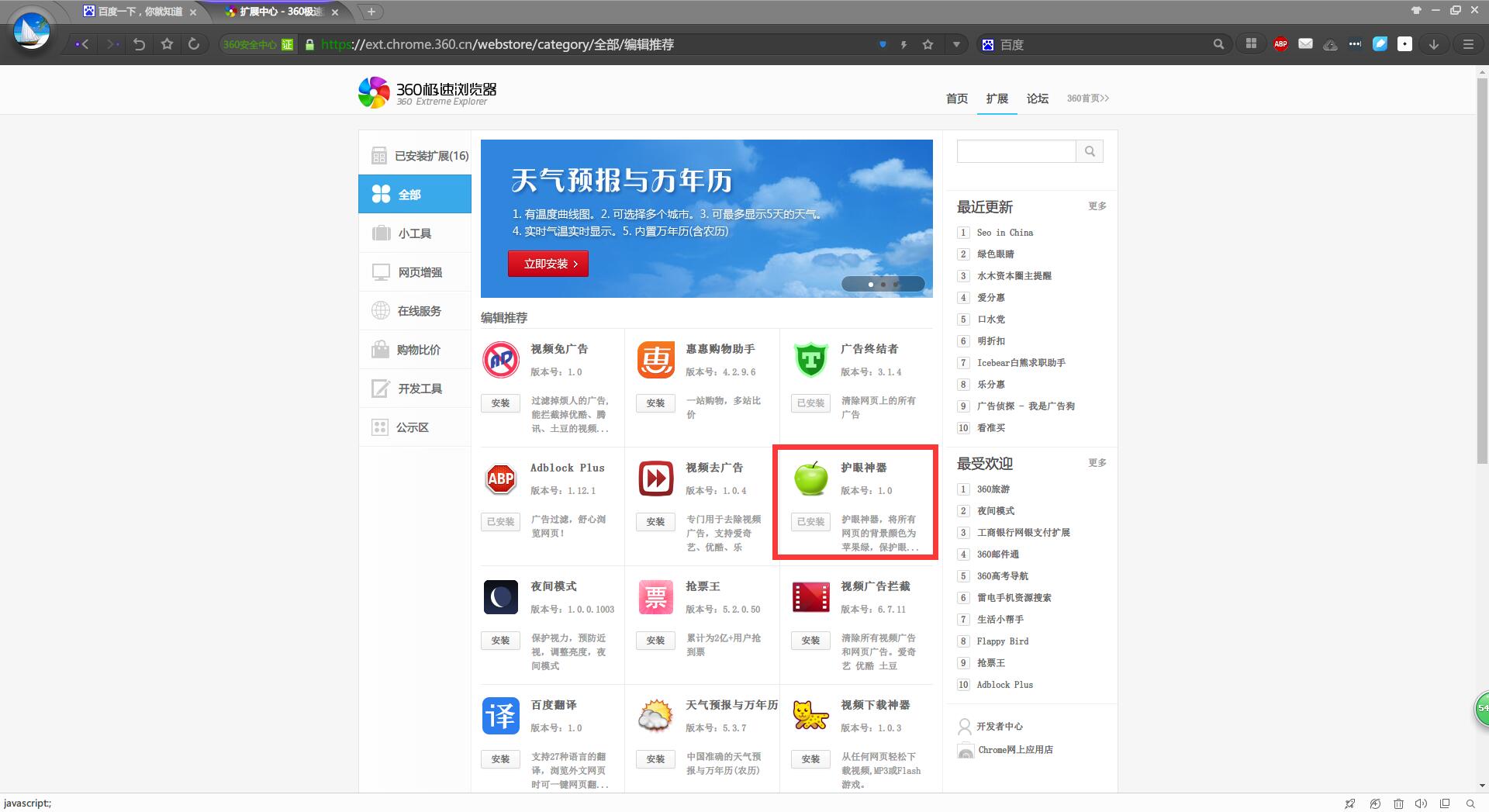 这里360浏览器修改背景颜色需要借助第三方插件,直接打开插件中心,安装护眼神器就可以了