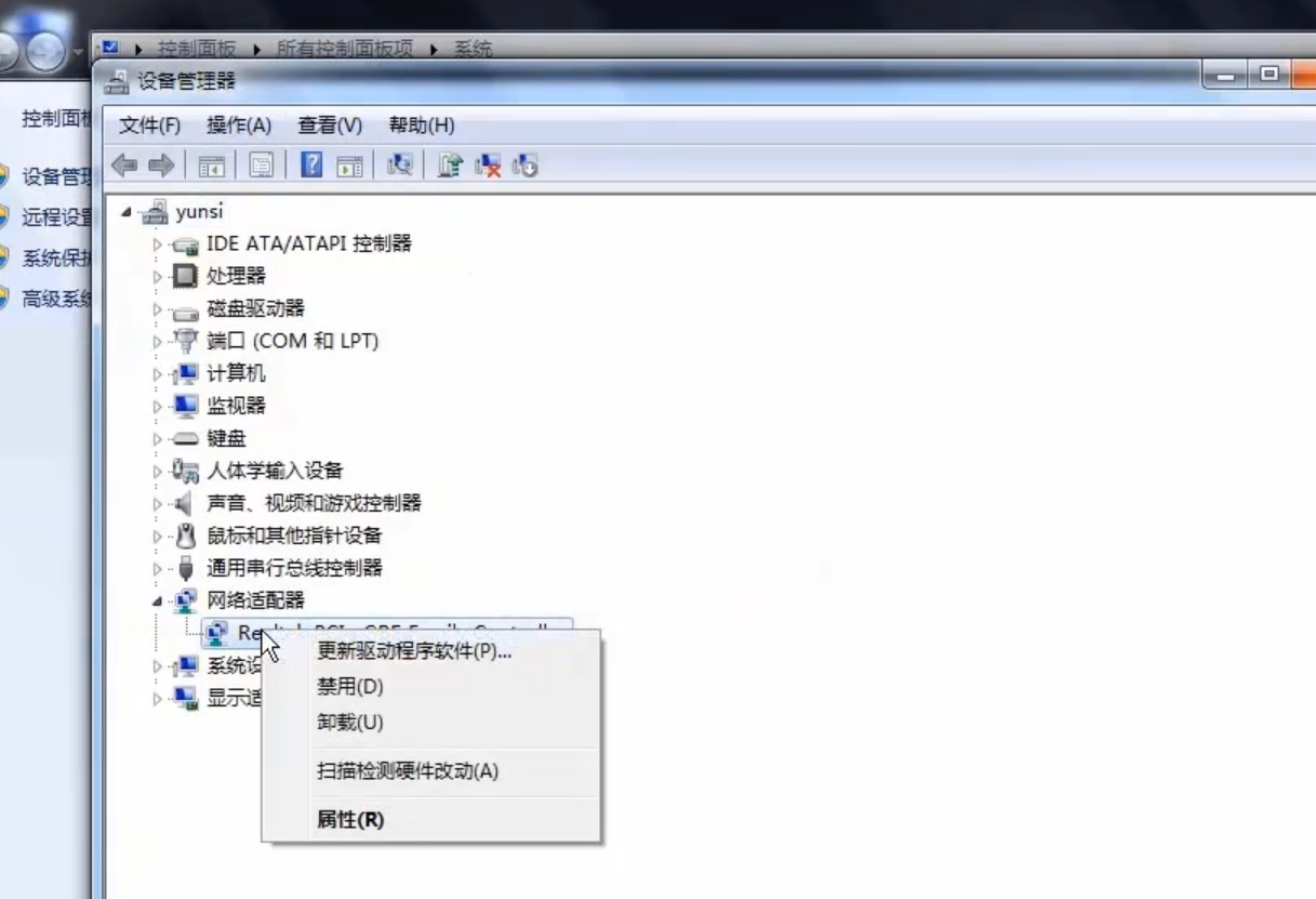 3.右键点击网卡设备选择更新驱动程序软件,选择自动搜索更新的驱动程序软件。