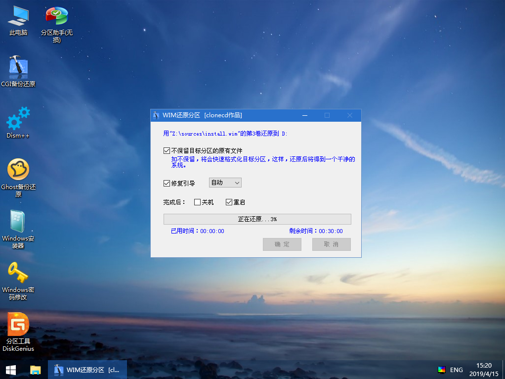 11、还原成功,自动重启进入系统安装界面(开始重启时,拔掉U盘)