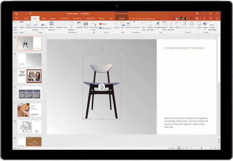 插入模型之后,可以利用鼠标拖拽实现 360 度旋转和改变大小。结合平滑切换功能,则可创造影院般的动画效果,更好地展示模型。此外,
