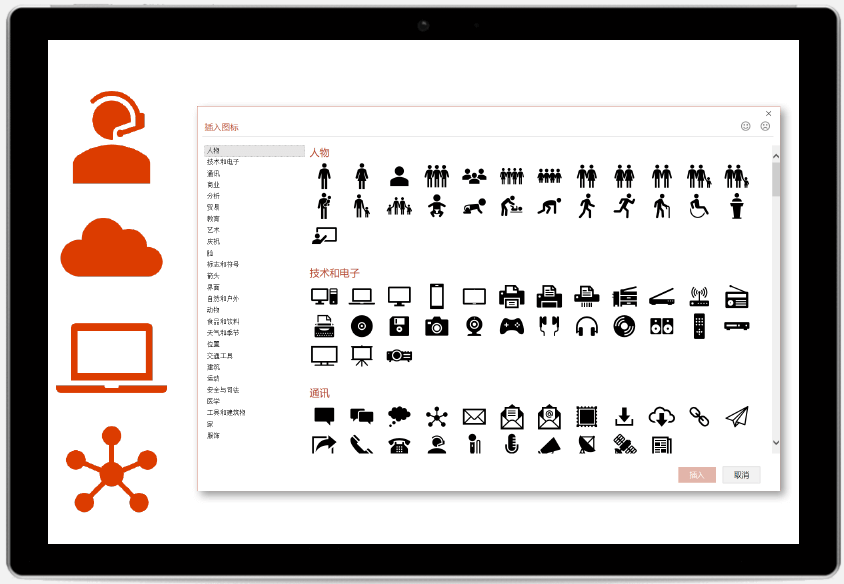 现在 Office 2019 为您提供了包含 500 个不同类别图标的 SVG 图标库,可以在文档、工作簿、演示文稿和电子邮箱中轻松插入所需图标,之后即可旋转、着色和调整大小,且不会损失任何图像质量。