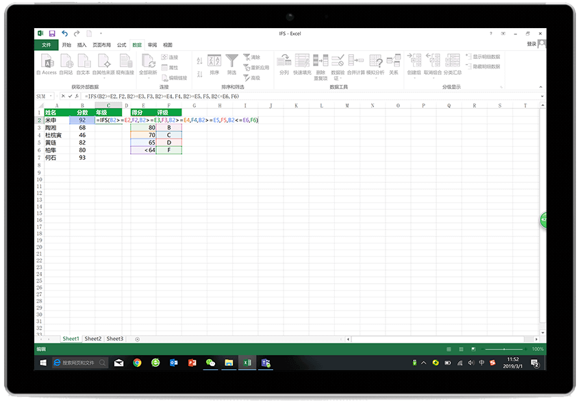 在多条件下,使用IF函数需要多层条件嵌套,让人头昏眼花。现在 Excel 2019 新增的 IFS(加个 S 表示多条件)函数,使用起来变得简单而直观。此外,还新增了文本连接的 Concat 函数和 TextJoin 函数。